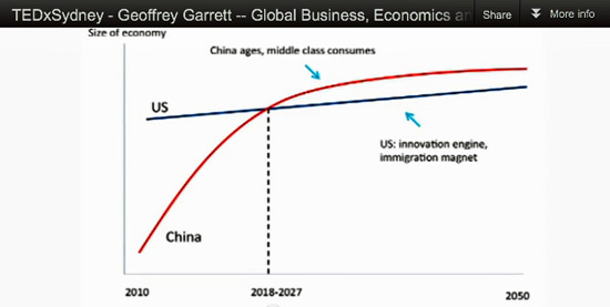 Sometime very soon China will displace the U.S as the largest economy in the world. This video talk by Garrett offers some significant insights for all global businesses and especially those of us in New Zealand and Australia.