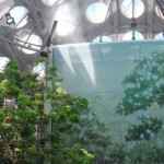 “Two enormous 90-foot-tall spheres — one housing a planetarium, the other a rain forest — beckon from either side of the lobby. They are the most solid forms in the building, yet seem to hover in the space. The base of the planetarium sphere floats in a pool; a broad ramp snakes around the rain-forest sphere. Enveloped in gnarled branches, the ramp seems to have been swallowed up by the jungle landscape over millenniums.