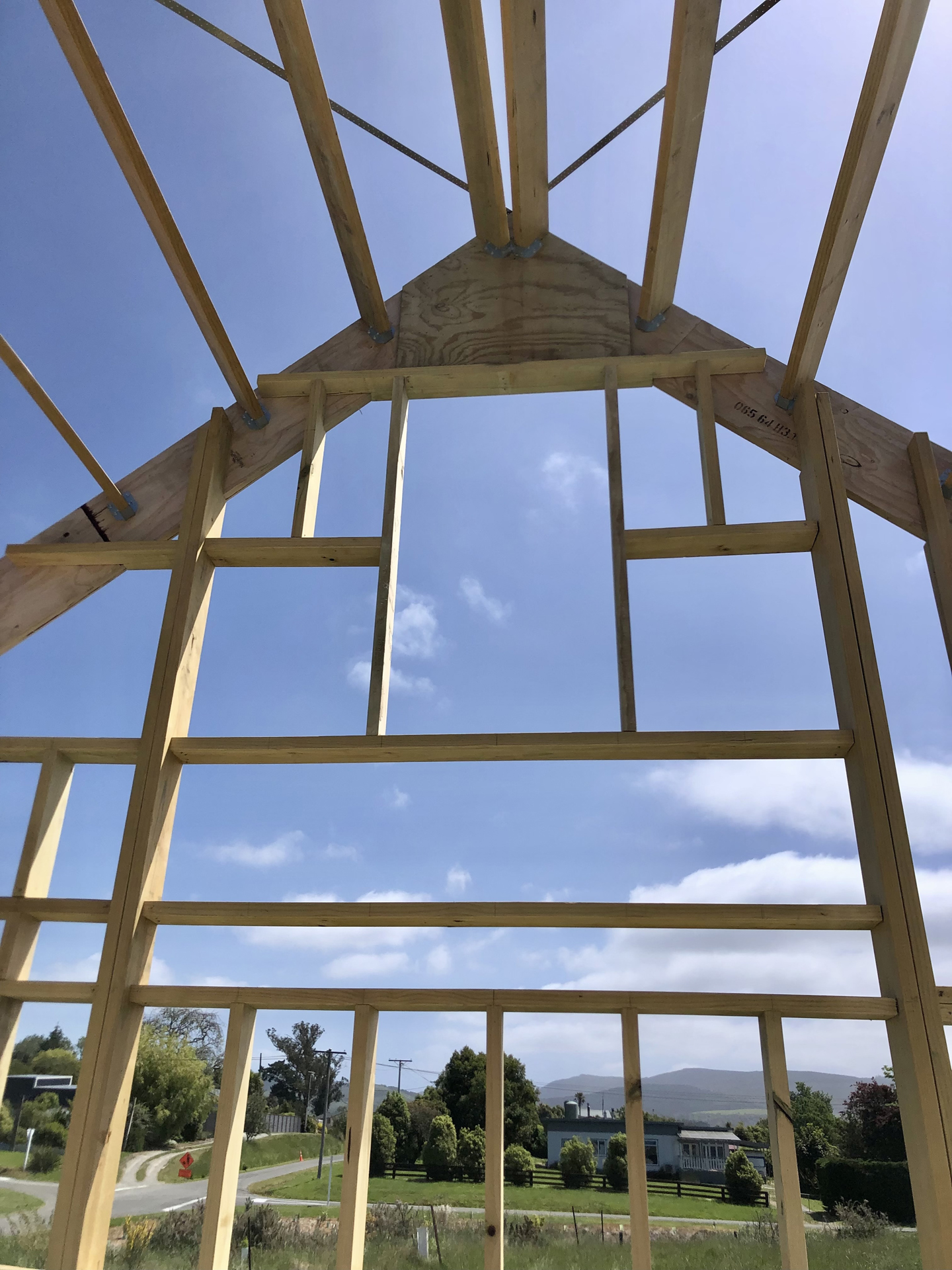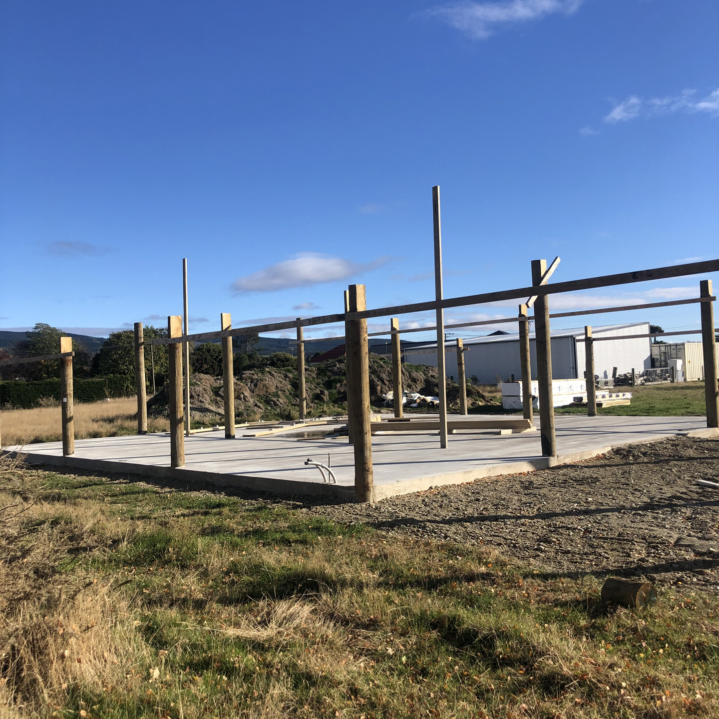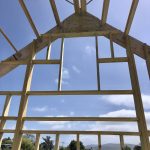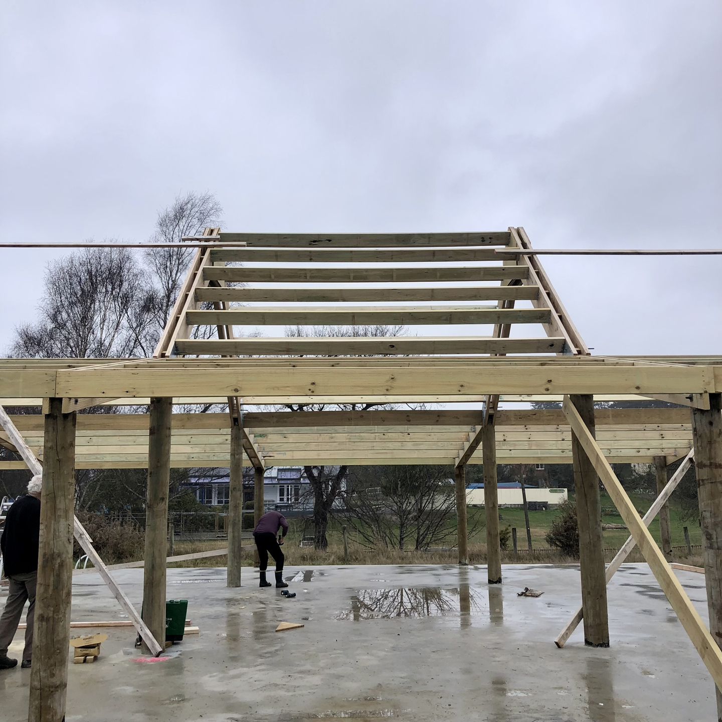 I have been putting up the occasional photo on my Instagram account. See here for an early photo of the poles, and concrete pad. The trusses came next and everything else I have been working on. More photos below.